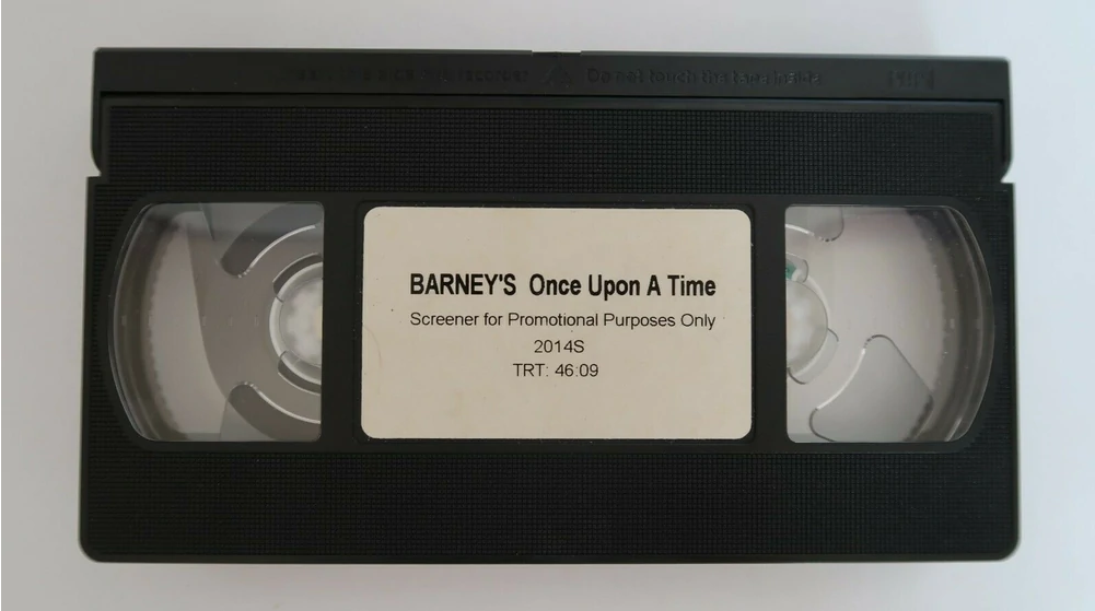My copy is a black tape with a sticker label that has the barney home.